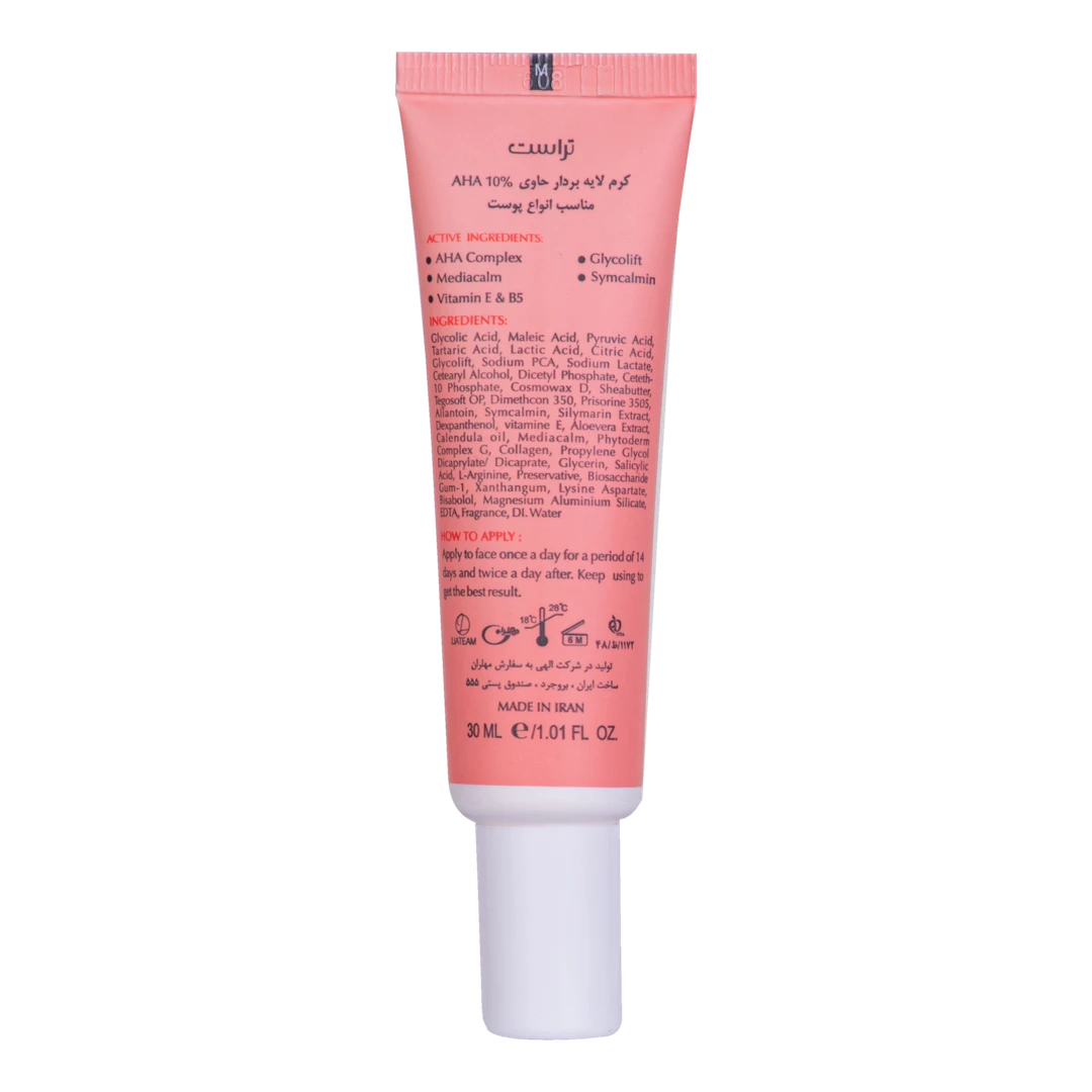 ضدچروك و رفع چروكهاي سطحی لايهبردار و پاكسازيكننده پوست روشن، شفاف و جوانكننده پوست افزايش تولید كلاژن و سفتكننده پوست مناسب انواع پوست جمعكننده منافذ باز پوست نوع عصاره آلوئهورا، روغن کالندولا مواد موثره کمپلکس آلفا هیدروکسی اسید، گلایکولیفت، مدیاکالم، سیمکالمین، ویتامینهای E و B5